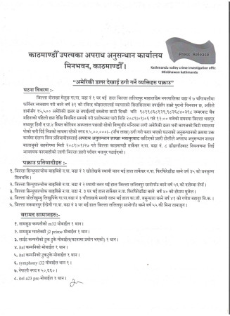 जिल्ला दोलखा मेलुङ गा.पा. वडा नं १ घर भई हाल जिल्ला ललितपुर माहालक्ष्मि नगरपालिका वडा नं ७ चाँगाथलीमा फर्निचर व्यवसाय गरी बस्ने वर्ष ३१ को रविन्द्र कोइरालालाई व्यापारको सिलसिलामा तपाईसँग हाम्रो पुरानो चिनजान छ, अहिले हामीसँग १५,५०० अमेरिकी डलर छ तपाईलाई सस्तोमा साटी दिन्छौ भनि ९८११८६८१२९,९८२६८४०३९८ नम्बरबाट चैत्र महिनाको पहिलो हप्ता देखि नियमित सम्पर्क गरी प्रलोभनमा पारी मिति २०८१।०१।०६ गते १२:०० बजेको समयमा जिल्ला भक्तपुर मध्यपुर ठिमी न.पा.४ स्थित कोरियन अस्पताल पछाडी रहेको बिष्णुवीर मन्दिरमा लगी अमेरिकी डलर भनी कागजको बिटो रुमालमा पोको पारी दिई निजको साथमा रहेको नगद रु।५,००,०००।– (पाँच लाख) ठगी गरी फरार भएको घटनाको अनुसन्धानको क्रममा उक्त कार्यमा संलग्न निम्न प्रतिवादीहरुलाई नियन्त्रणमा लिई आवश्यक कारवाहीको लागी जिल्ला प्रहरी परीसर भक्तपुर पठाईएको छ ।